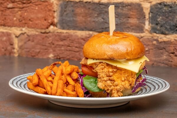 Served on a Brioche Bun with Baby Spinach, Cheese, Tomato and Honey Mustard Coleslaw with Sweet Potato Chips