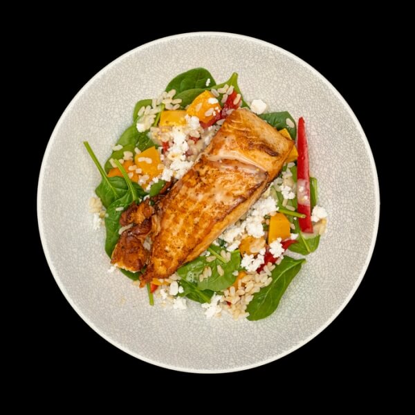 Served on a Baby Spinach, Brown Rice, Pumpkin, Red Capsicum and Feta Salad